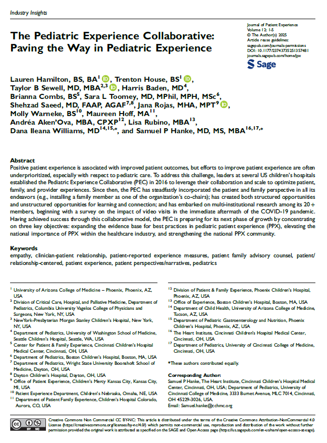 We are thrilled to share that our perspectives paper, The Pediatric Experience: Paving the Way in Pediatric Experience, has been officially published in the Journal of Patient Experience! Learn more about the original purpose of the collaborative, the journey thus far, and future directions as we strive to bring value to member organizations and the communities they serve.